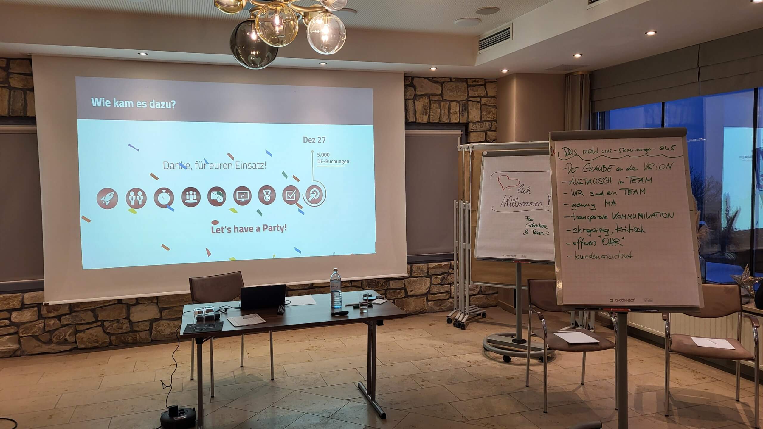 Gemeinsam versetzten wir uns ins Jahr 2028 und blickten gedanklich auf die Erfolge der vergangenen Jahre zurück. Ein zentrales Thema war dabei die mit Jahresbeginn gestartete Systemumstellung: Welche Verbesserungen brachte sie mit sich? Welche Abläufe wurden vereinfacht? Welche neuen Chancen haben sich ergeben – und wie erfolgreich konnte sich seminargo am deutschen Markt positionieren? Die Antworten waren durch die Bank und quer durch alle Abteilungen optimistisch, ambitioniert und voller Zuversicht. Dieser gemeinsame Blick nach vorne war enorm motivierend und sorgte für spürbare Euphorie im Raum. Ein großartiger und extrem verbindender „Gemeinschafts-Moment“, der natürlich mit einem Glas Sekt gebührend abgeschlossen werden musste :).